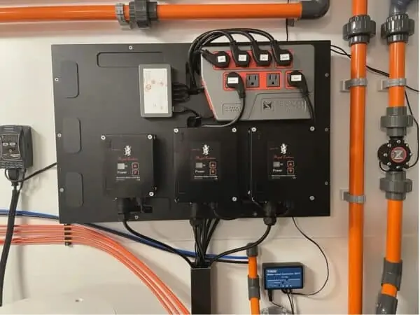 Das Controller Board verfügt über neun Aussparungen für die Kabelführung nach hinten, was eine saubere und übersichtliche Einrichtung gewährleistet. Darüber hinaus enthält das Kit Aussparungsstopfen und drei Schienen auf der Rückseite, um Ihre Kabel sicher und ordentlich aufzubewahren. Wenn Sie mehr Flexibilität benötigen, sind auch separat erhältliche Zubehörregale erhältlich, die an der Tafel montiert werden können, um verschiedene Arten von Geräten zu tragen, wie z. B. Dosierpumpen oder Behälter, die möglicherweise nicht direkt an der Tafel befestigt werden können.